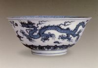 說 明: 龍紋為明、清兩代官窯器物的常見裝飾題材.除青花外,還有釉里紅、醬彩等品種.此碗無款識,內(nèi)壁光素無紋飾,外壁繪雙龍戲珠,動感強烈.