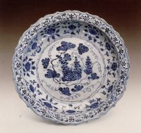 說(shuō) 明: 此盤圖案結(jié)構(gòu)繁密,色調(diào)濃艷.有結(jié)晶斑點(diǎn),濃重處凝聚成黑青色或藏青色,有金屬的錫光色澤.胎細(xì)白,釉肥潤(rùn),是明代景德鎮(zhèn)官窯中的精品.