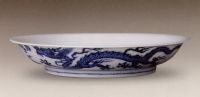 說 明: 此盤青花呈色濃艷,釉質滋潤.里心繪云紋,外繪雙龍趕珠.龍紋為永樂時期常見紋飾之一.永樂時期一種以海水為地、上繪龍紋的裝飾方法為后代所繼承.