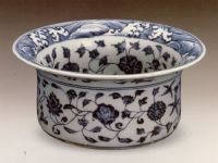 說 明: 釉面光滑細潤.以"蘇麻離青"料繪畫,青花發(fā)色濃艷,畫筆生動,為永樂時期的新造型,系受西亞文化影響下的產物.