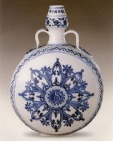 說 明: 此種瓶式創(chuàng)燒于明代永樂景德鎮(zhèn)御窯廠,造型和紋飾均摹仿西亞陶制品,亦稱"抱月瓶",或"寶月瓶",腹部紋飾亦稱"輪花".
