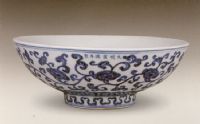 說 明: 此種口徑在二十五至三十厘米左右造型相同的大碗,款識均落在口沿下,外壁近足處均繪一周仰蓮瓣,唯主題紋飾和圈足邊飾有所不同,均繪畫精工,青花發(fā)色濃艷.