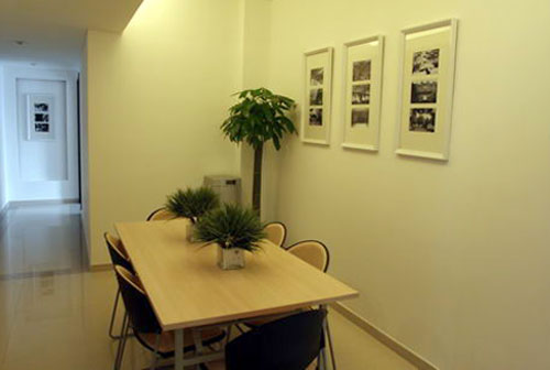 餐廳也是以干凈清爽的白色為主,白色的墻壁上掛了三幅畫,每幅畫中又三幅小畫組成,這組畫掛在白色的墻壁上充滿了老北京的懷舊感。簡(jiǎn)單原木色的六人餐桌顯得很現(xiàn)代,稍加觀察可以發(fā)現(xiàn)餐椅背后的別樣設(shè)計(jì),這符合了老外們對(duì)于生活的休閑設(shè)計(jì)。吊頂上設(shè)計(jì)了帶有色彩的射燈,射燈顏色為淡黃色,黃色既具有東方的柔美又表現(xiàn)了西方的神韻、現(xiàn)代又傳統(tǒng)、感性而又充滿理性。綠色的植物使整個(gè)空間充滿了生氣。