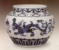 說(shuō) 明: 此罐外底有青花雙圈"大明宣德年制"六字雙行楷書(shū)款.形體飽滿(mǎn),畫(huà)面布局疏朗,紋飾生動(dòng)自然,青花發(fā)色濃艷,堪稱(chēng)宣德青花瓷器中的佳作.