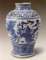 說 明: 此件整體古樸渾厚.胎體堅實厚重,青花呈色藍中泛灰,多有鐵銹斑,但不入胎骨.其主題紋飾充分表現(xiàn)了飛鳳的曲線美和運動美.