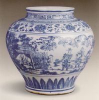 說 明: 人物繪畫生動,筆墨傳神,寓意深刻,并以大片云霧幻景做背景,人物瀟灑飄逸,有如在仙境中云游,仍有宣德青花人物之風(fēng)韻,這種形象在明中期以后逐漸發(fā)生變化.