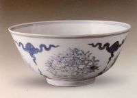 說 明: 此碗胎薄釉潤,紋飾筆法簡潔,線條流暢,青花色澤柔和雅致,透明清亮,底部青花雙方框內(nèi)楷書"大明成化年制"雙行六字款.