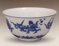 說 明: 胎質(zhì)細(xì)白堅(jiān)致,透明釉細(xì)潤,具有成化輕巧俊秀的造型特點(diǎn).青花發(fā)色清新淡雅,是典型的成化陂塘青的發(fā)色.碗底有帶雙方框的"大明成化年制"青花楷書款,是典型的成化官窯器物.