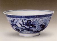 說(shuō) 明: 此碗以淡描海水為地,上繪九龍紋的方法在明初永樂(lè)、宣德時(shí)期已出現(xiàn),成化、弘治、正德諸朝沿用這一畫法,成為明代青花中常見(jiàn)的裝飾.