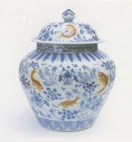 說 明: 以幽青雅致的青花繪蓮花和藻萍,鮮艷的黃上紅彩繪十二尾游魚.罐底青花雙圈"大明嘉靖年制"款.畫面生動,紋飾疏密均勻.