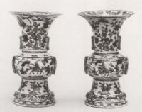 說 明: 仿銅觚式樣燒制.紋飾以黃、灰褐、黑三色釉彩繪.底有"大明萬歷年制"款文兩行.繪畫技巧高超,情景交融,充滿生活氣息.