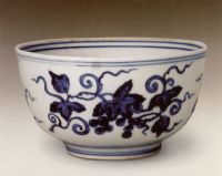 說 明: 此碗釉面白中泛青,青花淡雅柔和,是典型的國產(chǎn)青料所致.造型敦厚古拙.里外以青花為飾.足內(nèi)白釉無款.紋飾描畫精工,布局得當,是弘治青花的上品.