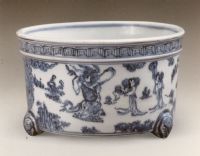說 明: 胎白釉厚,內(nèi)外白釉,溫潤似脂,釉下青花紋飾,白砂底.整個畫面表現(xiàn)的是昭君出塞的故事.