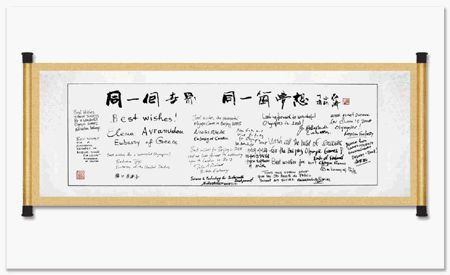 據(jù)了解,《永久和平》國禮青花瓷高48.5cm、口徑9.2cm、底徑17cm、周長95cm。采用青花工藝、梅瓶造型,梅瓶由景德鎮(zhèn)向全國征集經(jīng)大師嚴(yán)格評審選定,整個器形典雅大方,白如碧玉。構(gòu)圖按照“密不可透風(fēng),空可以跑馬”的美學(xué)法則,整體器形典雅大方。瓶身一面是古希臘衛(wèi)城,另一面是萬里長城,象征著奧林匹克從發(fā)源地來到了中國。瓷瓶的頸部繪有橄欖枝花環(huán),取“世界和平”之意,為熊鋼如大師繪制;瓷瓶下部蒼柏環(huán)抱是王錫良大師繪制,象征奧運精神萬古長青;云霧山色的“天青過雨景”是王恩懷大師手筆。其“天青過雨”的釉色決定了國禮青花瓷是青花瓷上品中的上品,也是最美麗的顏色。傳說中這種釉色必須在煙雨天才能燒出來。品鑒專家一致認(rèn)定:該款瓷精妙絕倫,富于禪意,體現(xiàn)了中國瓷藝的最高成就,堪稱當(dāng)代青花瓷王。