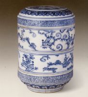 說(shuō) 明: 盒體呈燈籠式,分為三層.全器紋飾構(gòu)圖層次清楚,青花色澤淡雅,釉質(zhì)瑩潤(rùn),為正德青花瓷器中的上乘之作.