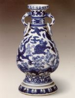 說 明: 青花發(fā)色艷麗.龍鳳雙耳瓶是嘉靖青花的典型器物,由于制作精美,后期萬歷朝及清代雍正朝均有仿燒.