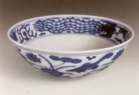 說 明: 內(nèi)底為團龍.外壁繪四組魚藻紋.圈足內(nèi)有"大明嘉靖年制"楷書款.
