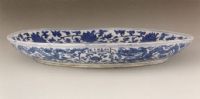 說 明: 此盤碩大規(guī)整,青花艷麗,標準的官窯用瓷.紋飾流暢,龍在莖葉纏繞的蓮花中游動,生動活潑,反映了工匠們高超的繪畫技能.
