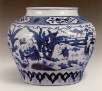 說 明: 此罐胎白堅細.釉泛微青.青花料色藍紫,人物神態(tài)生動.足底書青料"大明嘉靖年制"款.