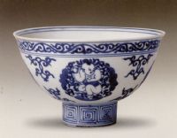 說 明: 此碗構(gòu)圖新穎,描繪生動,嬰孩嬌憨之態(tài)惟妙惟肖.足內(nèi)青花雙長方框內(nèi)楷書仿款"大明宣德年造".是隆慶青花瓷器的精美作品.