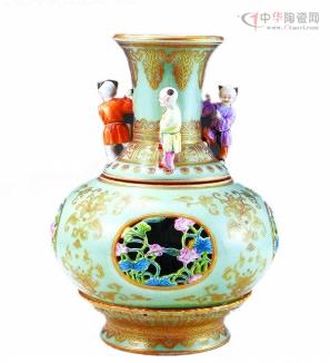 根據(jù)史料記載,清代乾隆初年,督窯官唐英為供皇帝觀賞曾經(jīng)獨(dú)創(chuàng)過一種新奇精巧的瓷器——轉(zhuǎn)心瓶,其構(gòu)思技藝巧奪天工,令人嘆為觀止,但復(fù)雜的工藝及艱難的燒制歷程使得這種瓷器極為罕見,存世就更為稀少;而在即將舉行的北京翰海2008春季拍賣會(huì)上,一件“清乾隆粉青釉描金鏤空開光粉彩荷蓮?fù)愚D(zhuǎn)心瓶”將讓收藏愛好者大開眼界。