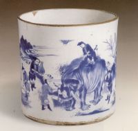 說(shuō) 明: 此器釉色白中閃青,光潔而欠肥潤(rùn).青花分色深沉有致,精雕細(xì)刻.是以版畫(huà)為藍(lán)本繪制的圖案,具有很高的藝術(shù)價(jià)值.