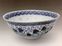 說 明: 此碗胎薄質(zhì)細(xì),色潔白,內(nèi)外施滿釉,釉色白中閃青,釉薄光潤且勻.造型秀麗,青花色澤濃艷,制作精致.
