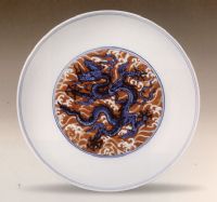 說 明: 宣德青花礬紅彩的特點(diǎn)是青花濃重艷麗,紅彩凝厚閃黑.