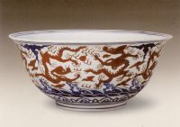 說 明: 青花紅彩是青花的派生品種,反映了當(dāng)時制瓷工藝的成熟,它既有青花的深沉含蓄,又有紅彩的鮮艷雅麗,兩者相映,別有情趣.