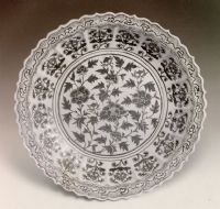 說 明: 此盤胎質(zhì)細(xì)膩,釉白微青.火石紅砂底.裝飾繁密,勾勒嫻熟.釉里紅料色黑中偏紅,邊沿微有散開的紅暈.這是元末明初釉里紅呈色的特征.