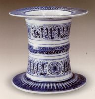 說 明: 青花顏色深沉,有暈散現(xiàn).紋飾及器型均受十三世紀(jì)西亞伊斯蘭教國(guó)家金、銀器和陶器的影響.造型新穎獨(dú)特.