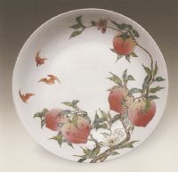 說 明: 此盤紋飾著色濃淡相宜,構圖亦生動活潑,有一枝紅杏出墻來的意境.