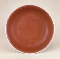 說(shuō) 明: 通體施紅釉,金彩雖已剝落,紋飾仍依稀可辨.口沿為燈草邊.足內(nèi)施青白釉.