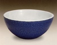說 明: 此件胎體厚重,堅(jiān)密潔白.灑藍(lán)釉色調(diào)深沉凝重,是宣德時(shí)期創(chuàng)燒的一種獨(dú)特釉色.內(nèi)底心青花雙圈書"大明宣德年制"款.