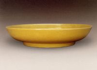 說 明: 胎質(zhì)細(xì)膩.釉色黃潤光滑,釉面晶瑩透澈.圈足內(nèi)有青花"大明弘治年制"款.