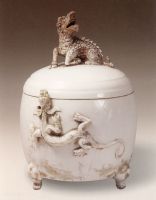 說(shuō) 明: 胎體厚重,通體施釉,色白釉厚.形制特殊.雕塑螭獸雄威,栩栩如生.