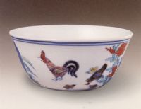 說 明: 雞缸杯為成化官窯新創(chuàng)之造型,因杯似缸形又外繪子母雞而得名,是成化斗彩瓷中的名品,屬御用酒具.