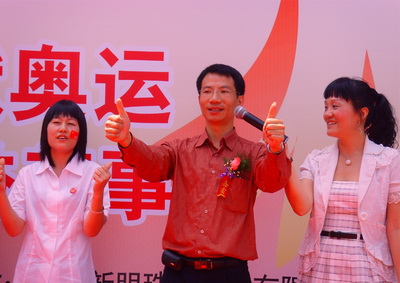 簡總帶著工作小組還為現場市民指導做奧運姿勢”中國加油 奧運加油”