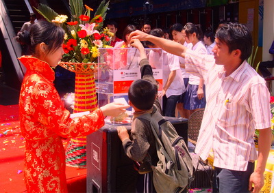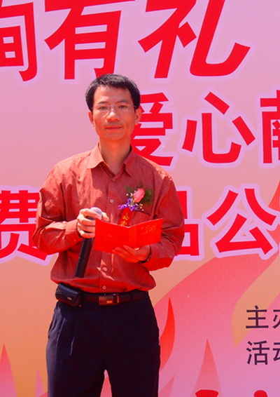 到今天活動的高潮, 金朝陽品牌總經理簡總和福州元成建材有限公司總經理王祥平為奧運之星基金會公益捐款開啟儀式揭開帷幕