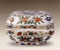 說(shuō) 明: 此盒成型較為復(fù)雜,用彩艷麗豐富,構(gòu)圖頗有意趣,是嘉靖彩瓷中少有的珍品.