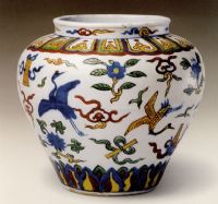 說 明: 此罐造型圓渾飽滿,紋飾粗獷豪放,圖案設(shè)色以青花、黃彩為主,清新雅致,具典型嘉靖五彩器特點.