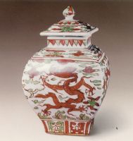 說 明: 此器主要以紅、綠彩涂飾,僅在龍的肘毛處略點(diǎn)黃彩,充分體現(xiàn)了嘉靖五彩瓷紅艷綠翠的藝術(shù)特色.