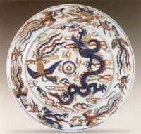 說 明: 此盤紋飾含有龍主陽為天、鳳主陰為地之意.構(gòu)圖精巧別致,色彩華麗明艷,制作精細(xì),是明代宮中御用五彩瓷器中的一件代表性作品.