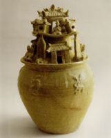 說 明: 倉上部系一上下兩層的建筑模型,下部呈罐形,腹壁附貼六個(gè)翩翩起舞的人像.
