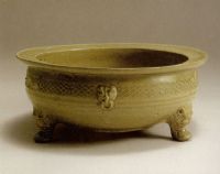 說 明: 上腹部模印一周斜網(wǎng)格紋.底部為三個形象威猛的獸形足.