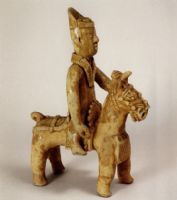 說(shuō) 明: 灰胎,刷青釉,胎釉結(jié)合不好,部份脫落.該俑人物面部及冠與馬頭飾,雕刻細(xì)膩傳神,不失為早期青瓷模俑類的優(yōu)秀作品.