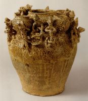 說 明: 該罐五罐相聯(lián)并舉,象征為"五谷豐登".瓷罐造型與人物塑像在表達內容與形式上達到了完美的統(tǒng)一.