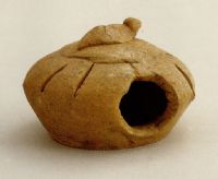 說 明: 施青釉略呈黃色,釉勻而不及底,整個(gè)雞籠雕塑簡(jiǎn)潔,富有想像力.