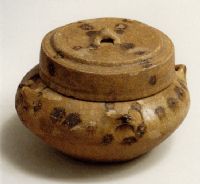 說 明: 此器的褐色點彩較豐富,蓋頂分布成"十"字形,肩部點綴一周,又以耳為中心,繞一圈,求得變化.