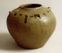 說(shuō) 明: 通體施釉,釉色青淡而顯白.肩部除附有四個(gè)橫耳外,各耳間飾有褐色點(diǎn)彩.